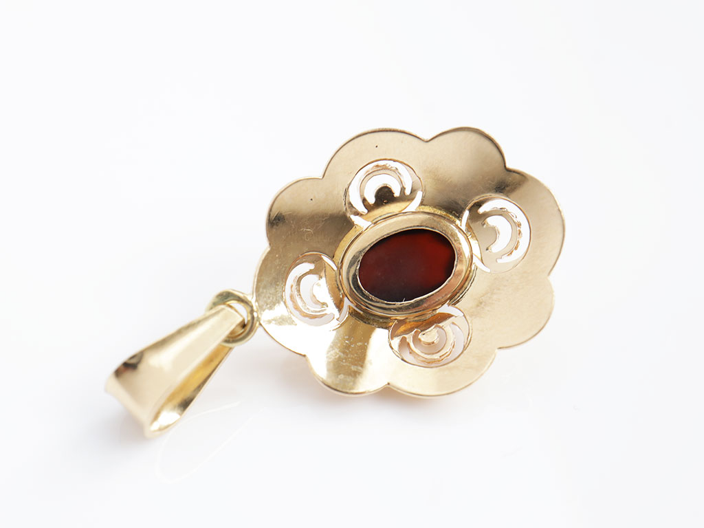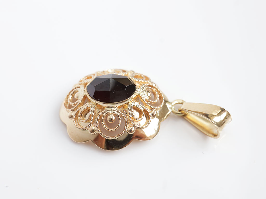 Z306-3080Deze vintage gouden hanger is gemaakt van 14 karaat goud. In het midden is deze met een granaat edelsteen gezet. Doordat deze facet geslepen is, ontstaat er een mooie schittering.