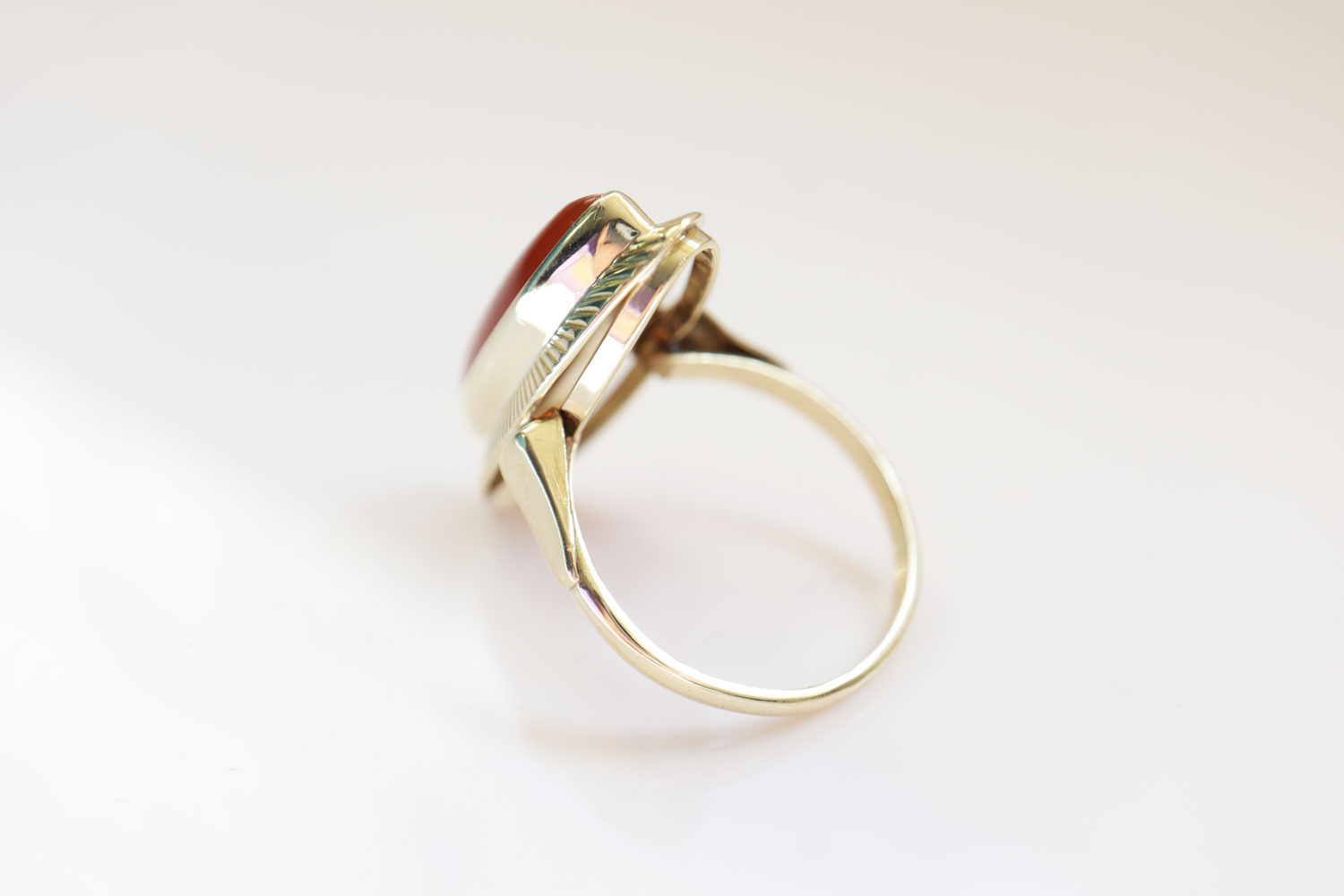 Deze vintage gouden dames ring is gemaakt van 14 karaat goud. De ring is gezet met een carneool en is voorzien van een bijzondere sierlijke bewerking, die de ring een op en top vintage uitstraling geeft.