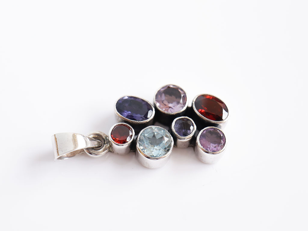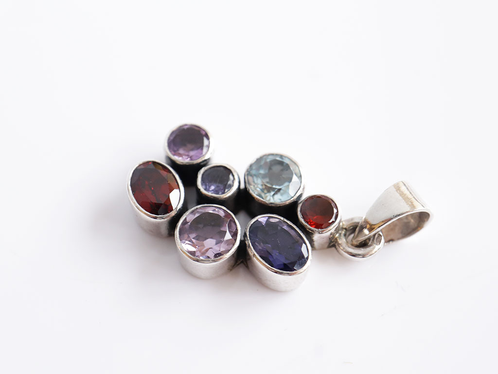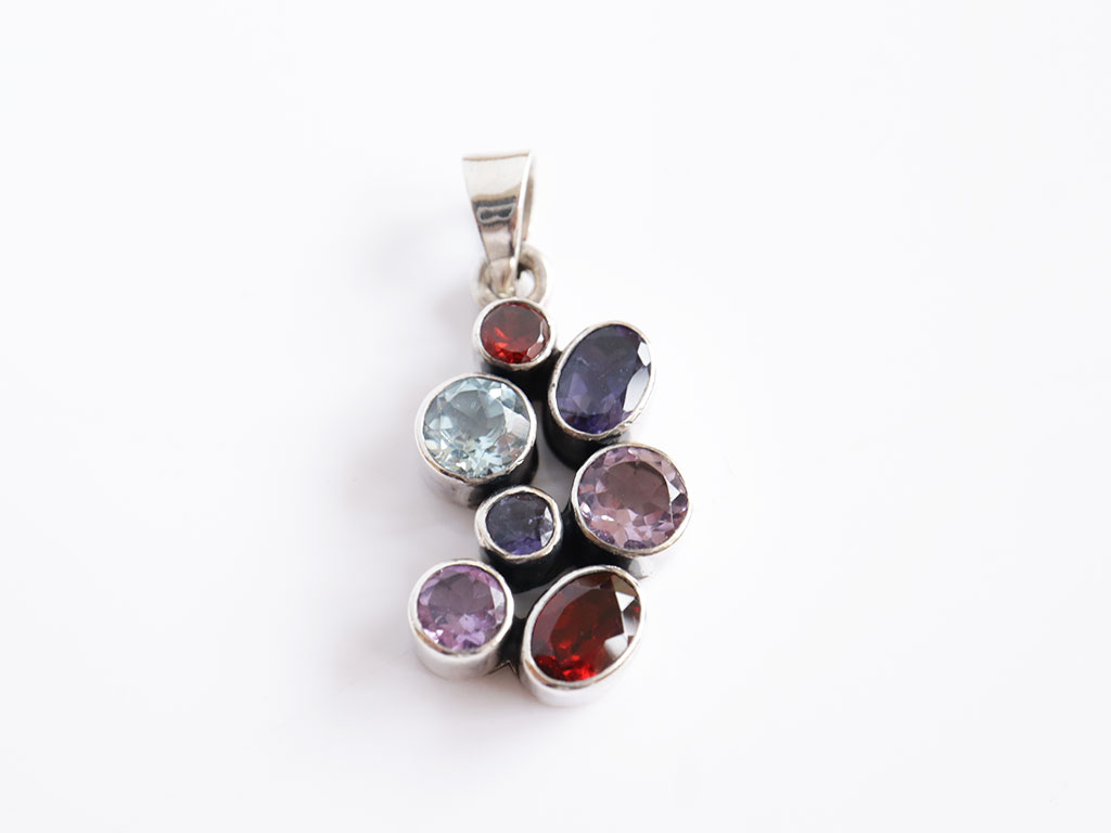 SZ11-111Deze zilveren hanger valt niet alleen op door de prachtige kleuren, maar ook door de vorm. De hanger bestaat uit 7 verschillende stenen in de kleuren: lichtblauw, paars, lila en rood. Contrasterend, maar perfect bij elkaar passend. De hanger is gemaakt van het hoogste gehalte zilver.